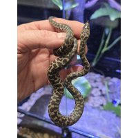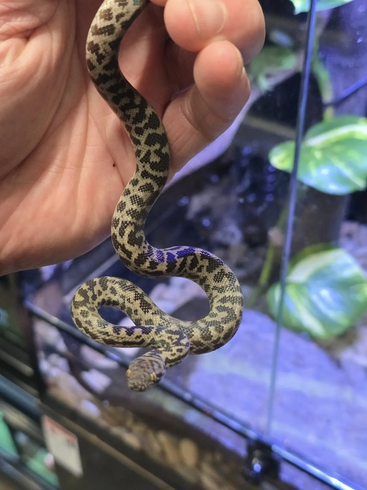 This python is one of the most distinctive in appearance with its shiny black head and yellow to beige coloured body, striped with orange to brown bands.