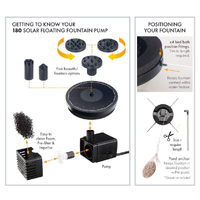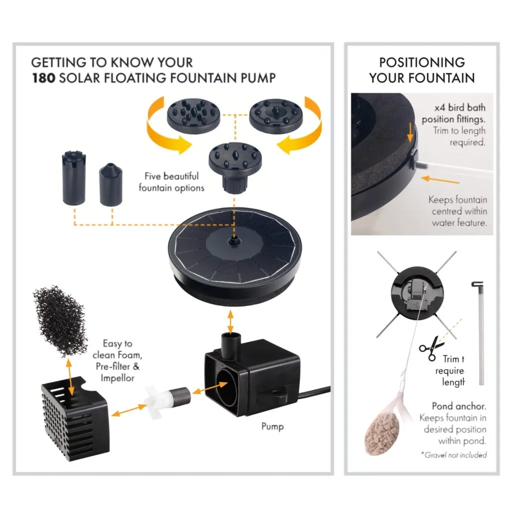 The Floating Solar Pump comes as a comprehensive kit, including: 5 attractive fountains heads to create a selection of attractive water displays, bird bath fittings to keep the fountain centred within a water feature and a pond or feature anchor to hold in position.