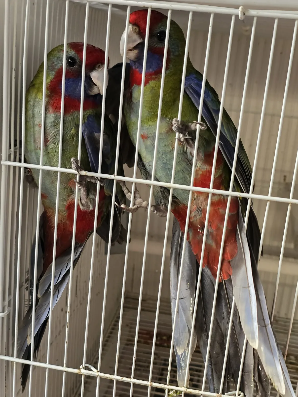 Crimson Rosellas thrive in spacious aviaries where they can fly and explore. They enjoy a varied diet of quality parrot seed, fresh fruits, and vegetables, along with natural branches and toys for enrichment.