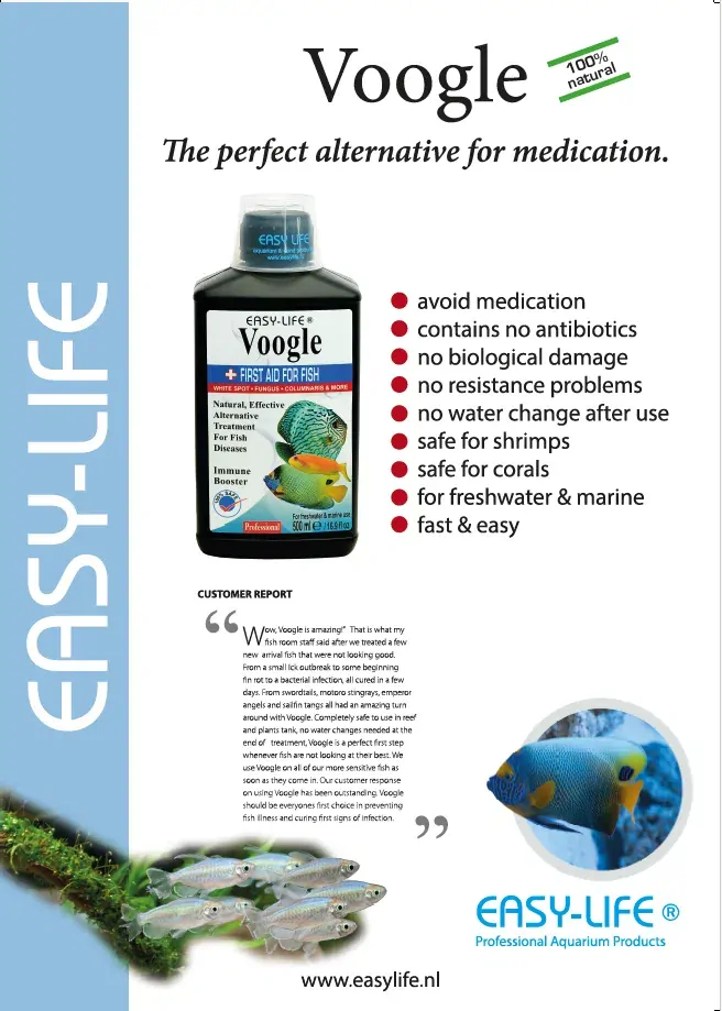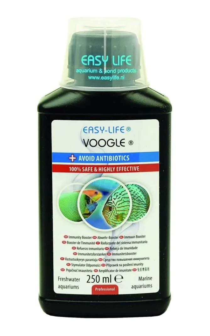 Voogle is a natural fish health treatment developed by Easy Life to boost the immune system of aquarium fish. It helps fish recover from infections, diseases, and wounds by enhancing their resistance to pathogens like bacteria, fungi, and parasites. Since it’s based on natural plant extracts and vitamins, it’s considered safe for fish, shrimp, and plants and doesn’t harm the biological filter in the aquarium.