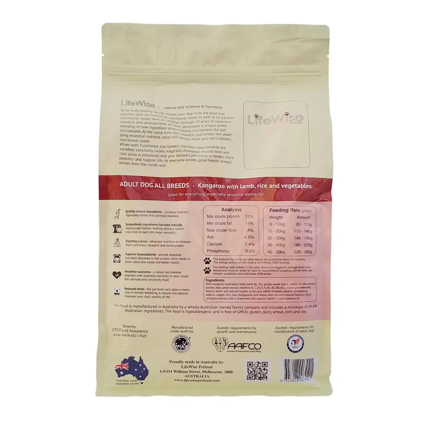 Wild kangaroo, Australian lamb, lamb fat stabilised with vitamin E and rosemary oil, oat groats, rice, narrow leaf lupins, alfalfa, kelp, carrots, spinach, parsley, yeast cell wall extract, vitamins A, C, D3, E, K, B1, B2, B6, B12, niacin, pantothenate, folacin, biotin, and natural organic acids, plus minerals calcium, phosphorus, sodium, copper, zinc, iron, manganese and iodine. Also contains natural flavours and Yucca schidigera extract.