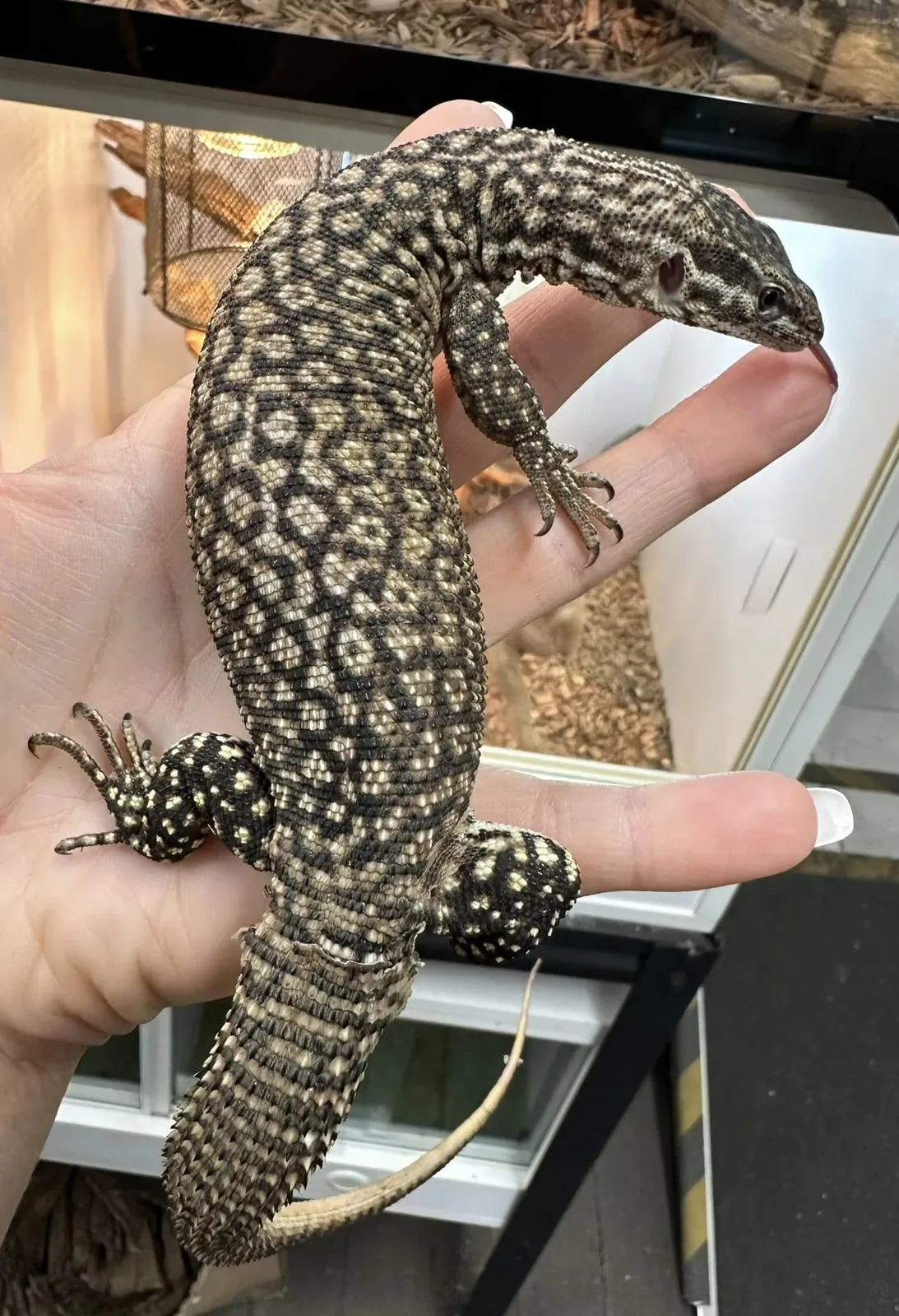 The Ridge-tailed Monitor, also called a Spiny Tailed Monitor is an attractively marked lizard with light brown round spots on the upper side. The head is patterned with dark brown and cream stripes. The tail has rows of rigid sharp spines forming ridges along its length.