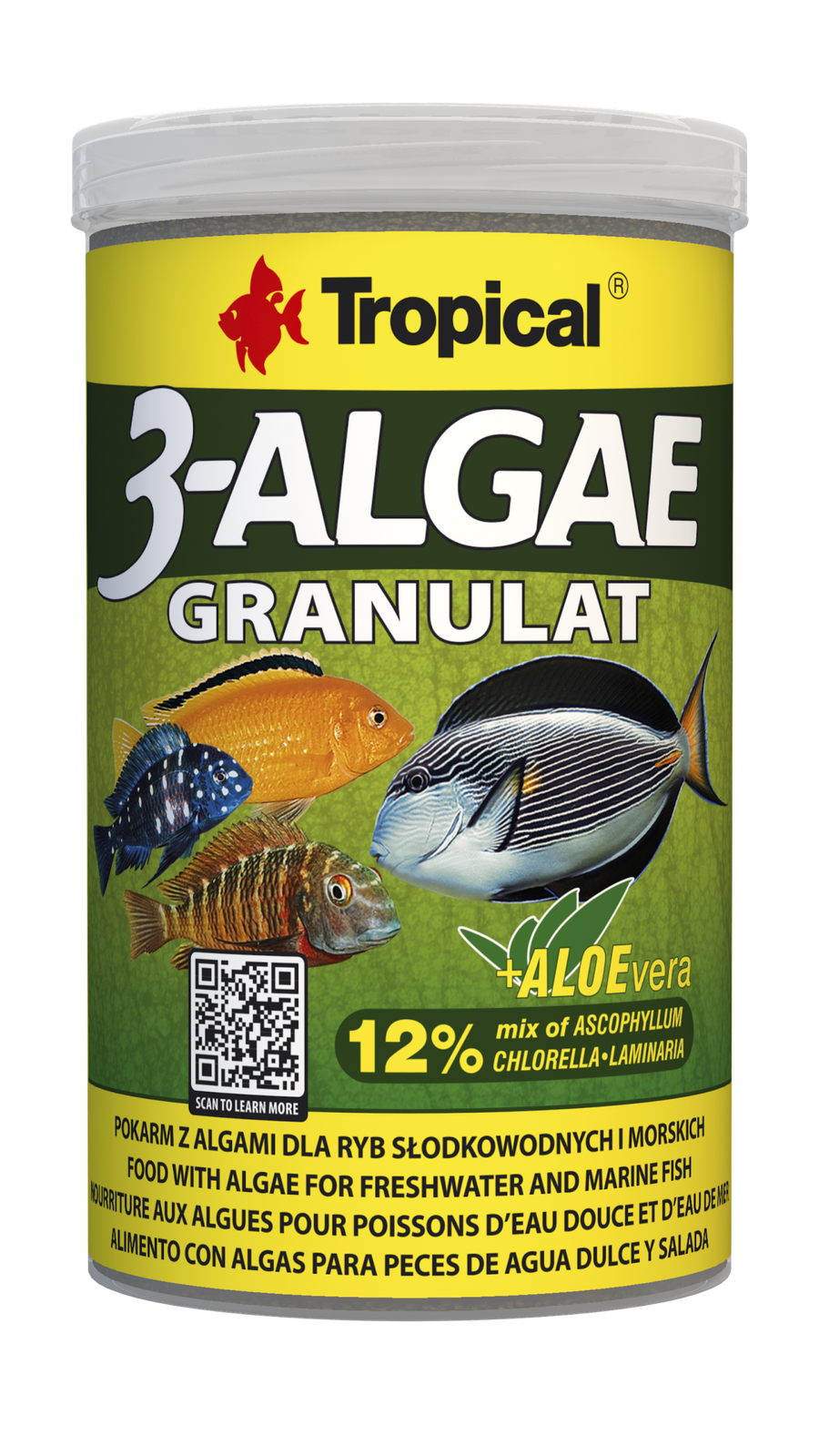 Tropical 3 Algae Granulat is a premium, algae-rich granulated fish food designed for both freshwater and marine aquariums. Formulated for herbivorous fish that rely on algae as a primary food source, it’s also an excellent supplementary diet for omnivorous species. The slow-sinking granules ensure easy access for mid-water and bottom-dwelling fish, promoting healthy feeding behaviour throughout the tank.